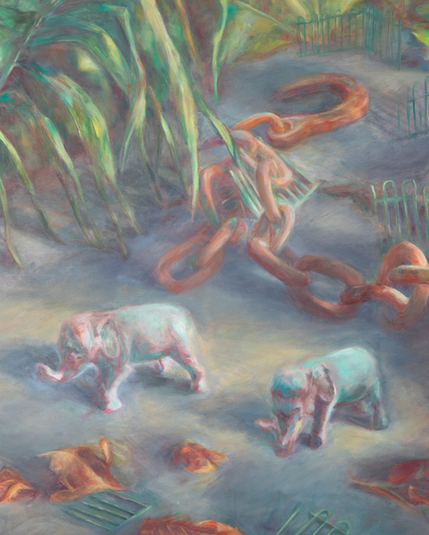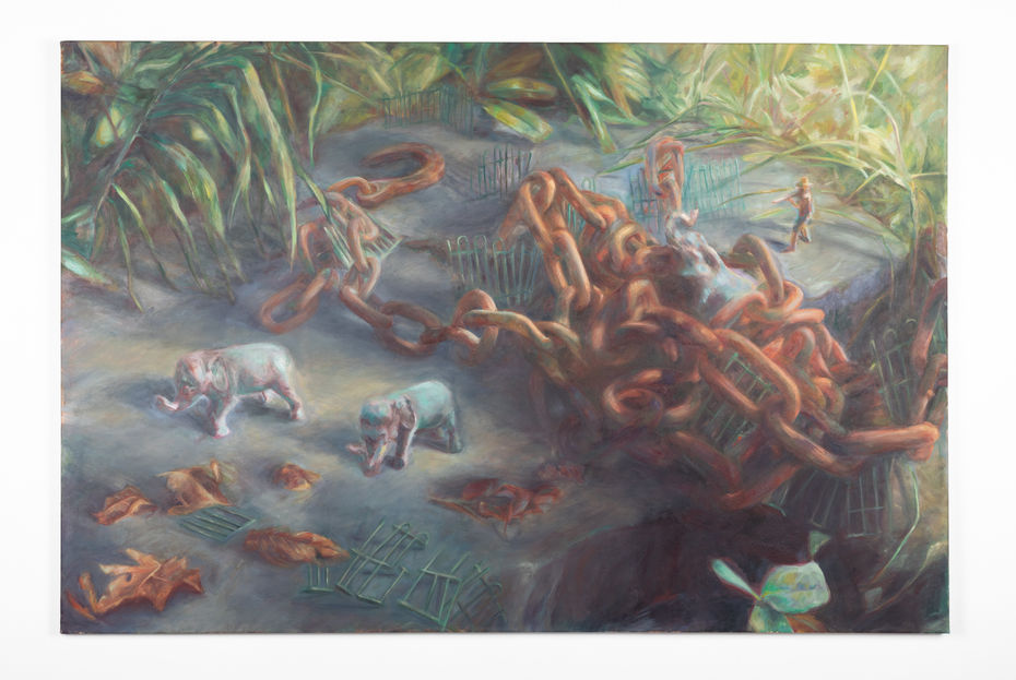 Les outils de capture et d’enfermement des animaux sont à la mesure de leur pouvoir de résistance. Dans une nature aux échelles distordues par les relations de pouvoir, des éléphants s’extirpent d’une lourde chaîne et du champ de tir d’un chasseur safari; le flou tente de masquer la violence au centre du tableau.